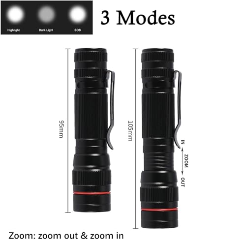 3 Lighting Modes & Zoomable: One button control of 3 lighting modes: High/Low/SOS. The zoomable design of the flashlight adjusts the focus as needed, giving you the freedom to choose a spotlight or floodlight for long distances or larger illuminated areas. You can adjust focus range for different usage, stretching to adjust its focus and get spot beam and flood beams you need
