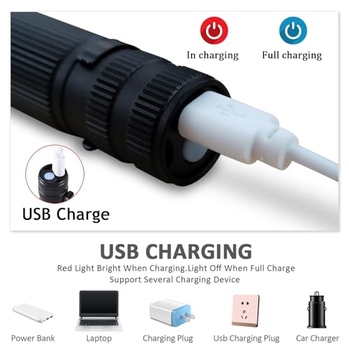 USB Rechargeable: This tactical flashlight Built-in rechargeable battery , You can charge this flashlight directly via the included USB cable. A full-press to switch on and off and a half-press to cycle through lighting modes (a rapid off-on press also cycles lighting modes). Push-button tail switch for easy one-handed operation, feel more comfortable and safe