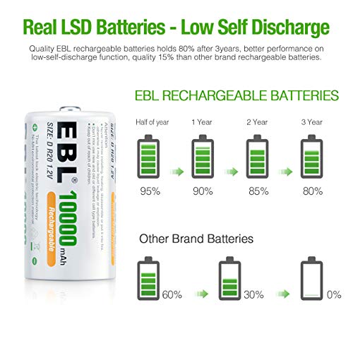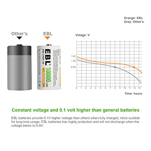 EBL Rechargeable D Batteries, 10000mAh Ni-MH High Capacity D Cell Battery New Retail Package, Pack of 4