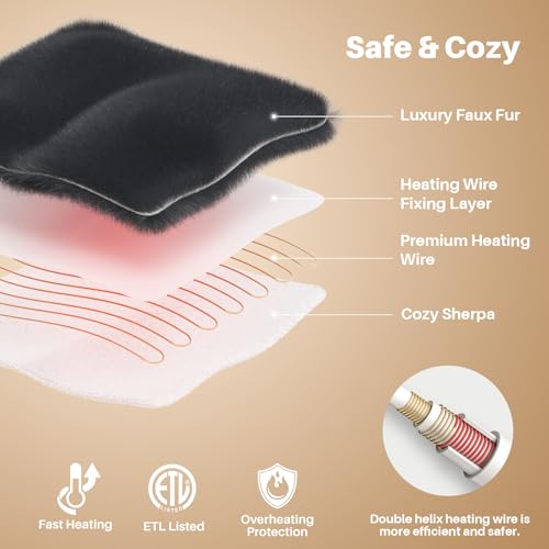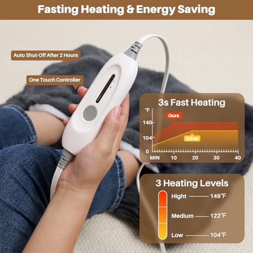 Quick Heating: Heats up in 3 seconds with 3 adjustable settings (104°F, 122°F, 149°F). 2-hour auto shutoff ensures safety and energy efficiency. Overheat protection prevents burns. Machine washable for easy care and maintenance.