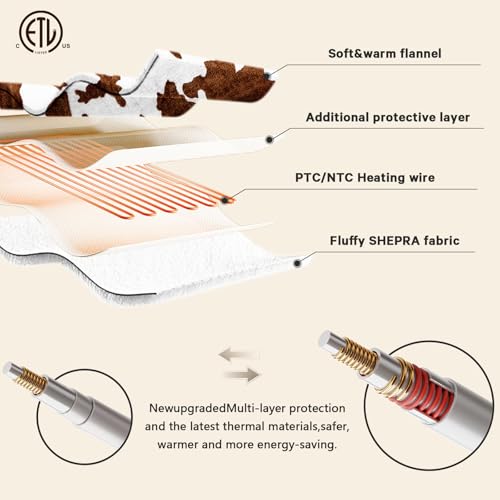 SAFE AND RELIABLE: The heating blanket throw has ETL certificate. The sample cow print throw blanket undergoes rigorous testing, including 50,000+ bend cycles on its heating wires and advanced overheating safeguards. The scratch-resistant PC control panel survives frequent machine washing and folding, ensuring durability far beyond usb heating blanket. Also,our single controls of the heater blankets electric are made of high-temperature-resistant materials.