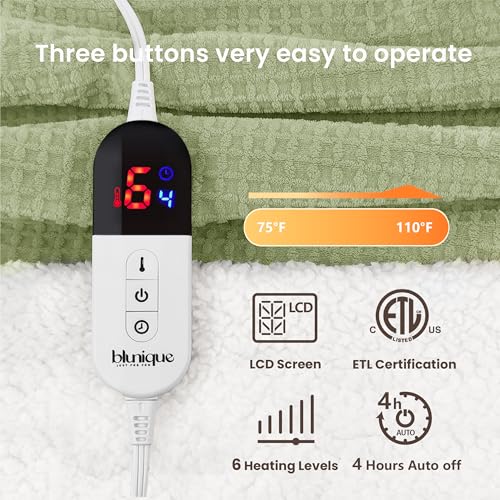 Safety First: ETL certified and equipped with default settings, the electric heated blanket boasts 6 temperature control levels (75°F-110°F) and customizable auto-off times (1h-4h). Utilizing advanced Ultrasonic Heat Sealing Technology and Overlock for robust insulation and flame resistance, our product ensures no safety hazards—please rest assured to use. With our automatic shutdown feature, enjoy worry-free relaxation and energy conservation. Embrace safety and warmth with confidence.blunique – where safety meets serenity.
