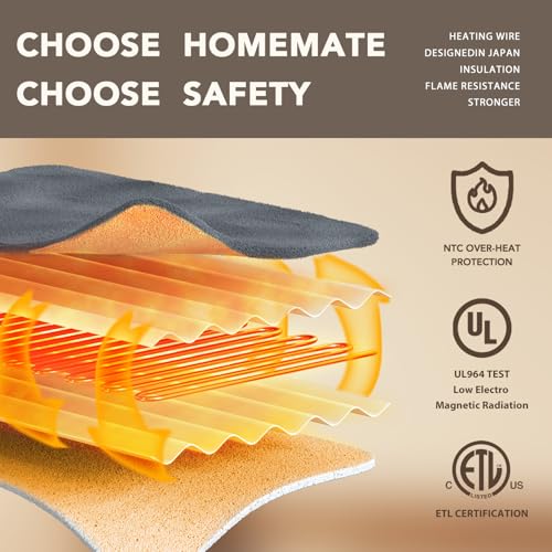 ★SAFETY: Homemate Electric blankets have passed the American safety UL964 Test.Have ETL Certification.Lower Electro Magnetic Radiation.The heating wire is designed and produced by Japanese company,more advanced technology,stronger insulation and flame resistance.Moreover,the heated blanket use NTC overheating protection technology, 8 hours auto shut off to ensure that it will not overheat and cause burning.