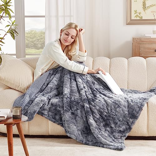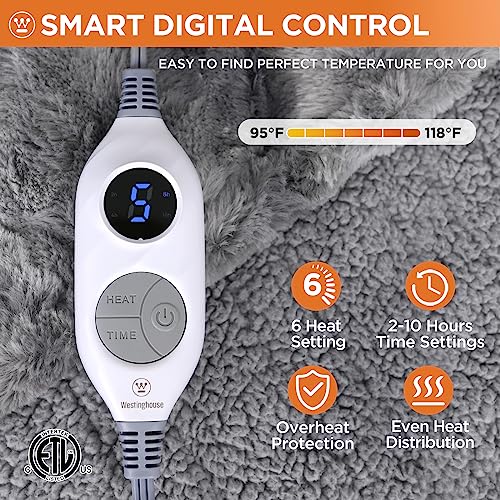 Westinghouse Electric Heated Throw Blanket, Faux Fur with 6 Heating Levels & Auto Off, Soft Cozy Sherpa Washable Blanket (50″ x 60″, Grey)