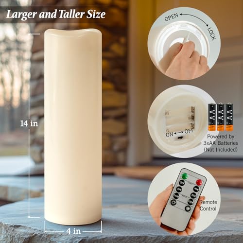 4″ x 14″ Large Waterproof Outdoor Flameless Candles Battery Operated LED Flickering Pillar Candles with Remote and Timer for Indoor Outdoor Lanterns, Off White, Long Lasting, Set of 2