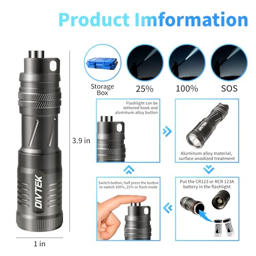 Mini Flashlight Design, Illuminate your adventures with our Waterproof Mini Flashlight, perfect for diving, hiking, camping, EDC flashing lights…Made of high-quality aluminum alloy, include tail button, this Divtek compact torch is designed for durability and reliability in any outdoor situation.