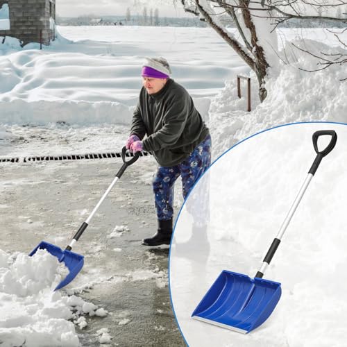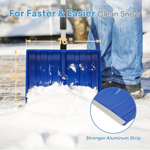 16 Inch Wide Snow Shovel Snow Pusher with Aluminum Handle and Aluminum Strip, Large Snow Shovel for Driveway Home Patio Walkways Snow Removal, Blue