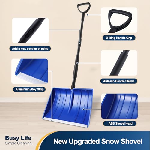 Yocada Snow Shovel 55 inch Long for Driveway Home Garage Snow Removal with D-Grip Handle Aluminum Strip Large Capacity Shovel for Garden Car Camping Outdoor Blue