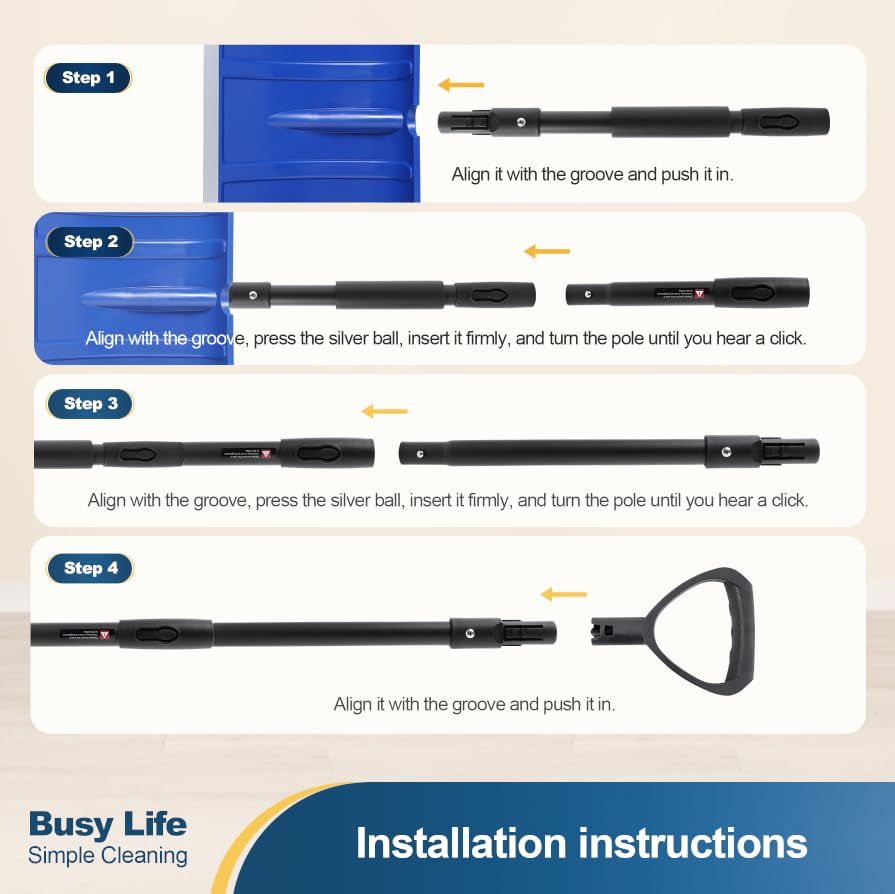 Yocada Snow Shovel 55 inch Long: Our shovel is easy to install, you can just connect the poles. When installing, you can refer to our installation picture or installation video, when connecting the pole, you need to use greater strength. Align with the groove, press the silver ball, insert it firmly, and turn the pole until you hear a click