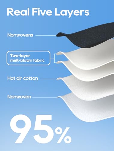 【Real Five Layers】 This KN95 mask consists of two layers of non-woven fabric, two layers of meltblown inner layer and one layer of hot air cotton, which can efficiently filter dust, PM2.5, haze, smoke and automobile exhaust, etc., with a filtration efficiency of more than 95%.